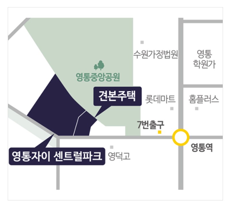 영통자이 센트럴파크는 교통, 학원가, 생활편의시설 등이 가까워 입지 환경이 좋은 것으로 알려져 있습니다. 가장 가까운 수인분당선 역통역은 도보로 7분 거리이며, 광역버스를 이용한다면 강남까지 1시간이면 도착할 수 있는 곳입니다.