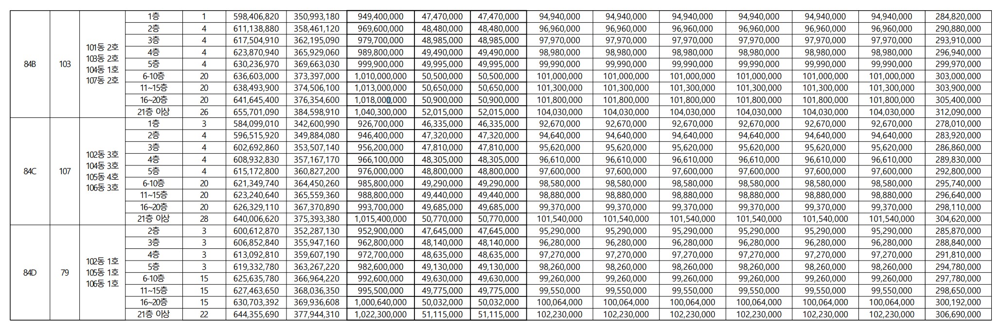 84A는 9억 3천 ~ 10억 1천, 84B는 9억 5천 ~ 10억 4천, 84C는 9억 3천 ~ 10억 1천, 84D는 9억 5천 ~ 10억 2천 정도입니다. 베란다 확장이나 옵션은 불포함된 가격입니다.