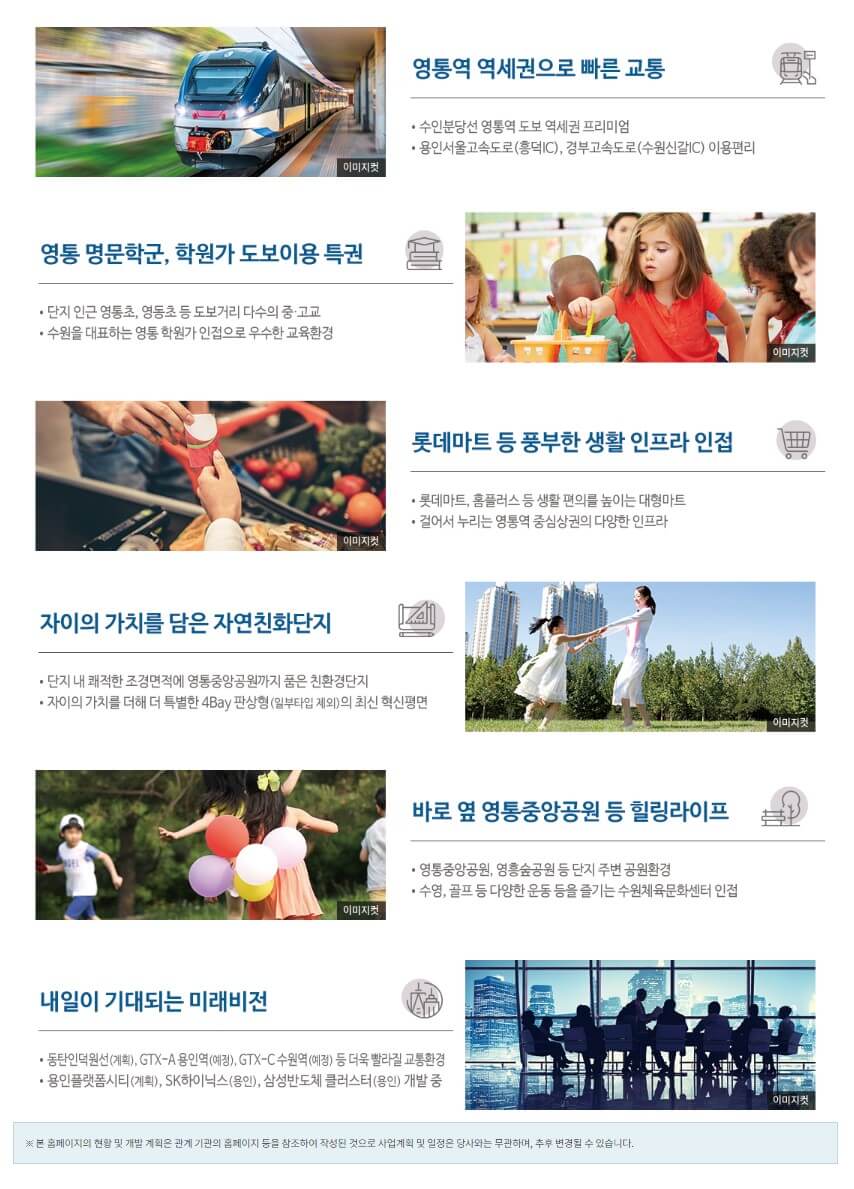 또한 도보 가능한 거리에 초중고 10여 개의 학교가 있으며 영통 학원가도 도보로 이동이 가능한 거리입니다. 홈플러스와 롯데마트 등 영통역 부근의 번화가도 손쉽게 이용할 수 있으며, 크고 작은 공원도 생활환경의 수준을 높여주고 있습니다.