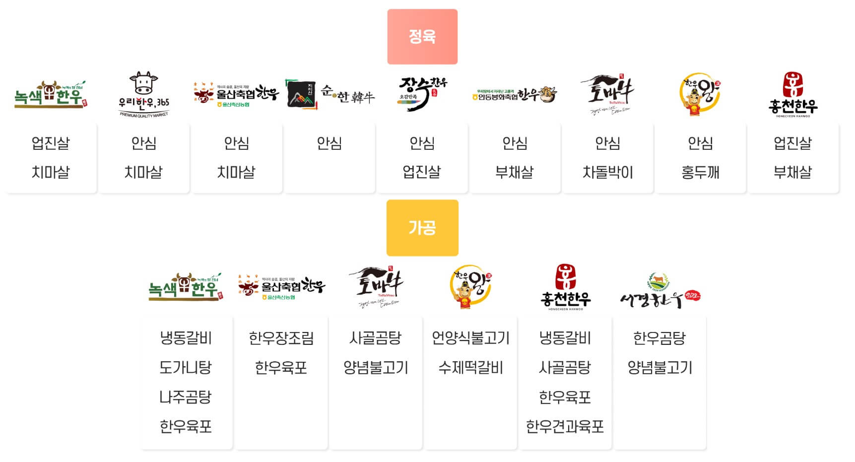 각 한우브랜드는 세일판매되는 구이, 불고기, 국거리 품목 외에도 브랜드별로 업진살, 치마살, 안심, 차돌박이, 홍두깨, 부채살 등의 다양한 부위를 판매하고 있으니 참고하세요.