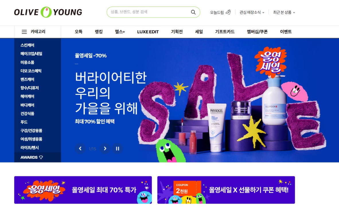다양하고 합리적인 상품 구성으로 평소에도 올리브영을 이용하시는 분이 많으실 텐데요, 올리브영이 9월을 맞아 올영세일을 진행합니다. 온 오프라인 동시에 진행되는 올영 세일은 최대 70%까지 할인된 가격으로 구입하실 수 있습니다. 세일기간에 받을 수 있는 할인쿠폰 받으시고, 특히 인기 있는 선착순 특가 상품은 매진되기 전에 서두르시기 바랍니다.