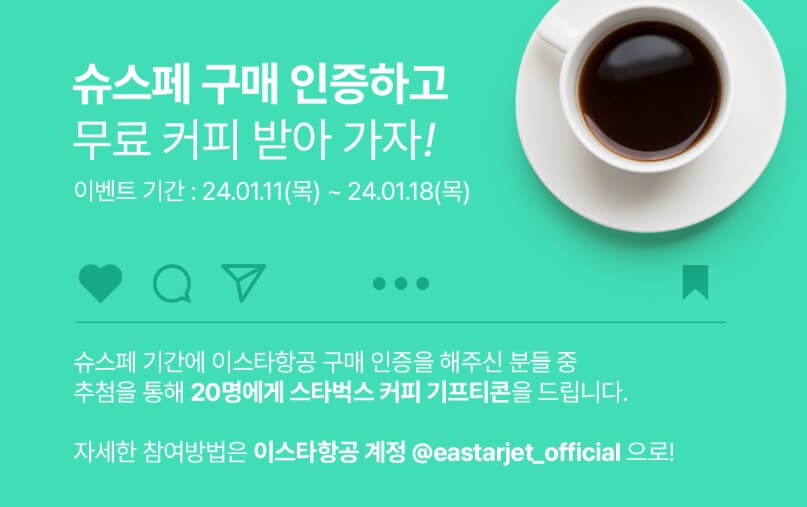 슈퍼스타페스타 기간에 이스타항공의 항공권을 구매하고 인증을 해주신 분들 중 추첨을 통해 20명에게 스타벅스 커피 기프티콘을 증정합니다. 항공권도 싸게 구입하고 커피도 챙기세요.