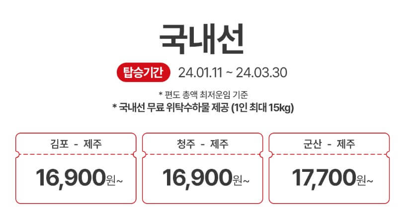 제주는 편도 16,900원에 위탁수하물도 15kg까지 가능합니다. 제주는 김포, 청주, 군산에서 출발하는 일정이라 지방에 계신 분들이 반가워할 것 같습니다.