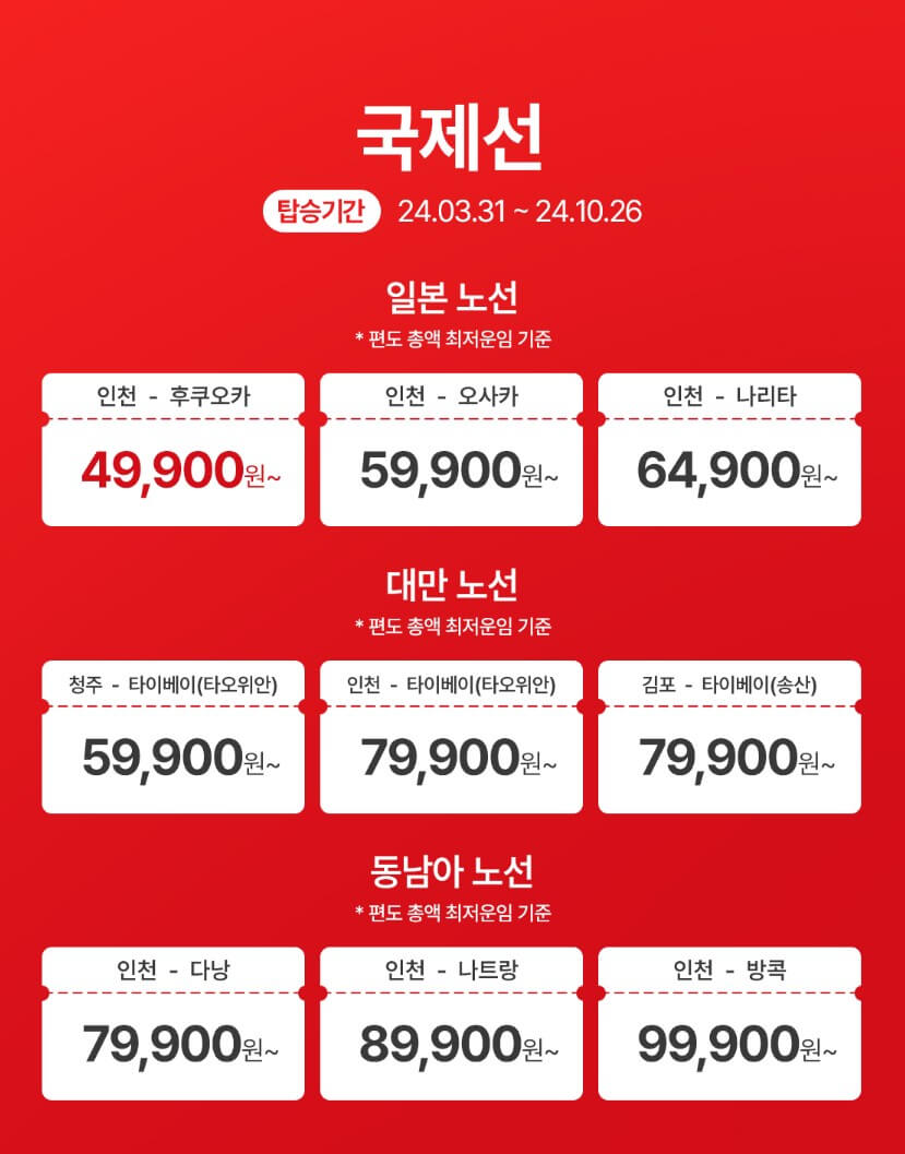 주의하실 것은 국제선과 국내선의 탑승기간이 다르다는 점입니다. 이번에 예매하실 수 있는 특가 요금의 국제선은 3월 31일 ~ 10월 26일, 제주는 1월 11일 ~ 3월 30일 사이에 출발하는 항공편입니다.