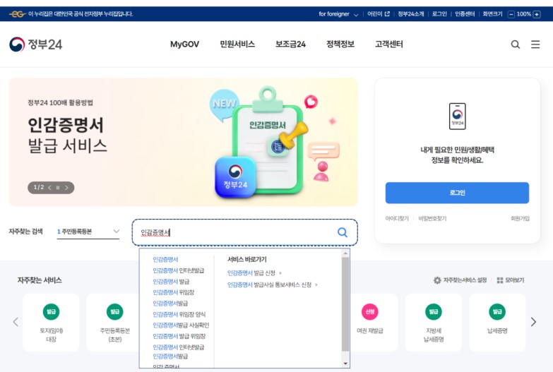 로그인 후에는 메인 홈페이지에서 검색어로 인감증명서를 입력하여 인감증명서 발급으로 바로가기를 선택합니다.