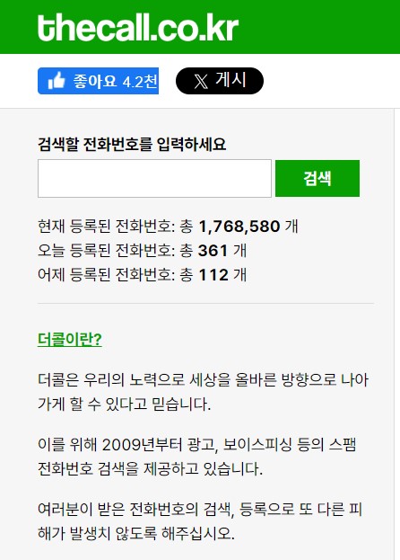 약 170만개의 전화번호 정보를 보유한 사이트입니다. 각종 광고 전화번호도 있어서 스팸 여부를 비교적 정확히 알 수 있습니다. 등록되지 않은 번호는 전화번호를 기반으로 주소를 명기하며, 유사 번호로 위치와 상호 등을 유추할 수 있는 기능도 있습니다.
