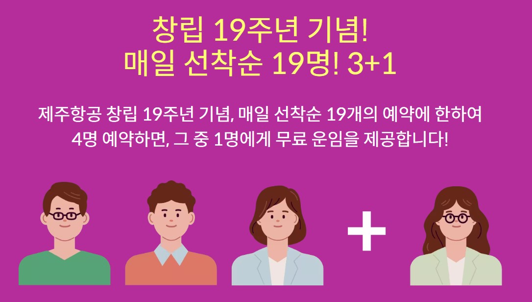 제주항공 창립 19주년을 기념해 매일 선착순 19개의 예약에 한하여 4명을 예약하면 그중 1명에게 무료 운임을 제공합니다. 중국노선을 제외한 한국에서 출발하는 국제선 전 노선에 해당되며 1월 16일(화) 17시까지 진행됩니다.