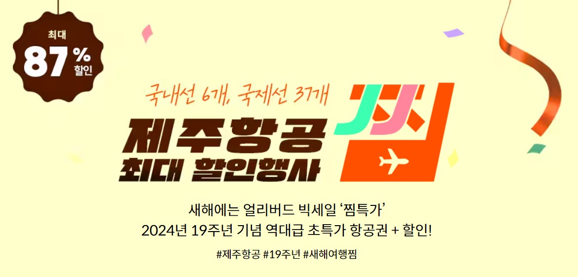 제주항공이 최대 87%까지 할인된 금액으로 국내선과 국제선 할인 이벤트에 들어갔습니다. 제주항공은 괌, 사이판을 비롯해 필리핀, 태국, 미얀마, 몽골까지 다양한 노선을 운영하고 있는 데다, 2024년 10월 탑승 예약까지 할인되어 올여름휴가를 미리 준비할 수 있습니다. 특가에 할인을 더하는 방법까지 항공권 싸게 사는 방법을 알려드립니다. 저렴한 좌석부터 마감되니 서두르세요.