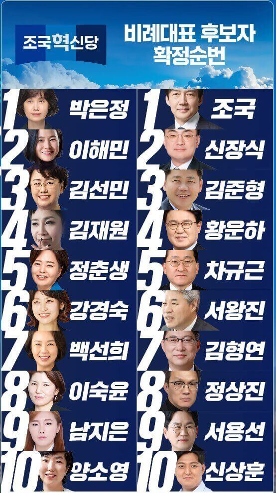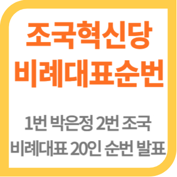 조국혁신당이 당원과 국민참여선거인단의 참여로 이틀간 진행된 온라인 투표 결과 비례대표 후보 명단과 순번을 확정, 발표했습니다. 가장 궁금한 1번은 박은정, 조국은 2번으로 확정되었습니다. 총 20명의 비례대표 순번을 알아보겠습니다.