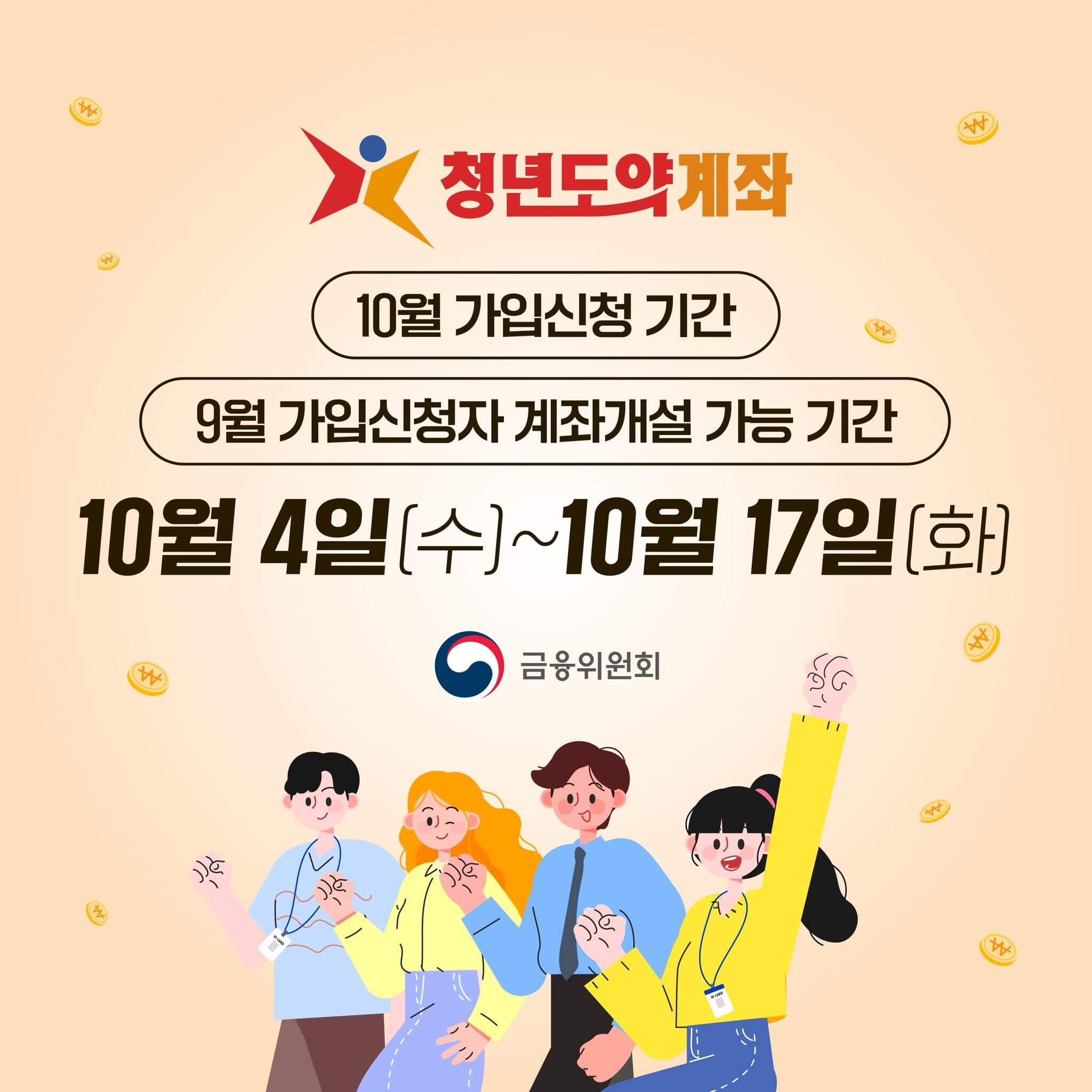 청년도약계좌는 대개 매월 초순~중순에 신청받고 다음 달 초에 계좌를 개설하게 됩니다. 이번 10월은 연휴가 끝나는 10월 4일(수)부터 17일(화)까지입니다. 기존 신청자 중 절차를 완료하지 못했거나 계좌를 개설하지 못한 신청자는 가입요건을 확인한 후에 이번에 재신청이 가능합니다.