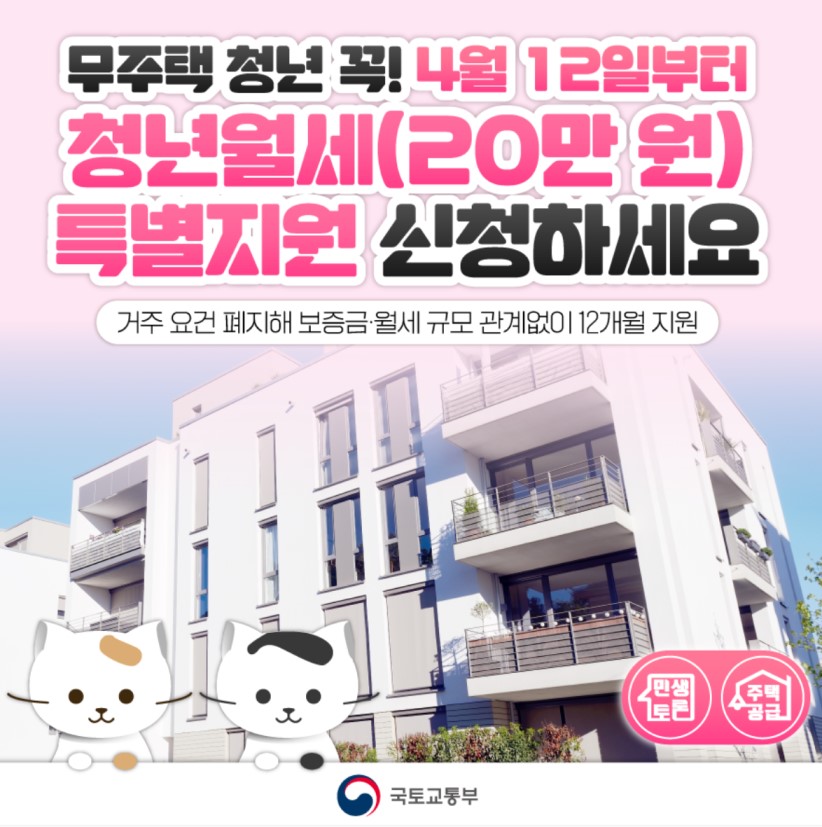 청년 가구에 대해 보증금, 월세금액 등 기존의 기준을 없애 특별 지원하는 것으로 청년 가구와 부모님 가구의 소득 수준만 맞는다면 월세 지원이 가능합니다. 19세 이상이 되면 2025년 2월 25일까지 어느 때라도 수시로 접수 가능하니 꼭 지원받으시기 바랍니다.