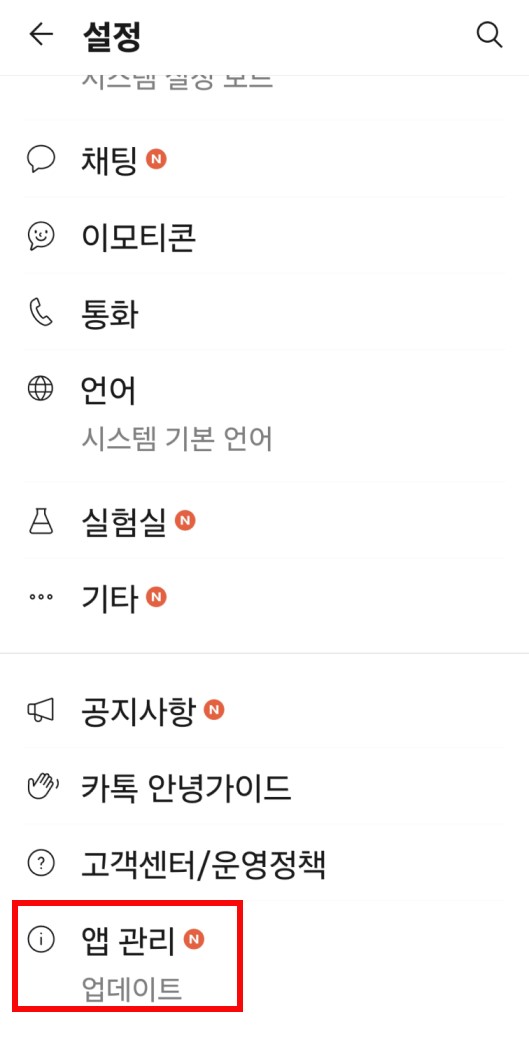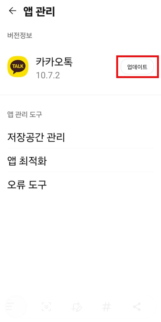 전체 설정 메뉴로 들어가 하단의 앱 관리를 터치하시면 현재 사용 중인 카카오톡의 버전을 확인할 수 있습니다. 바로 옆의 업데이트 버튼이 보이면 터치해주세요. 업데이트 화면으로 이동하고 하단의 업데이트 버튼을 터치하시면 업데이트가 진행됩니다.