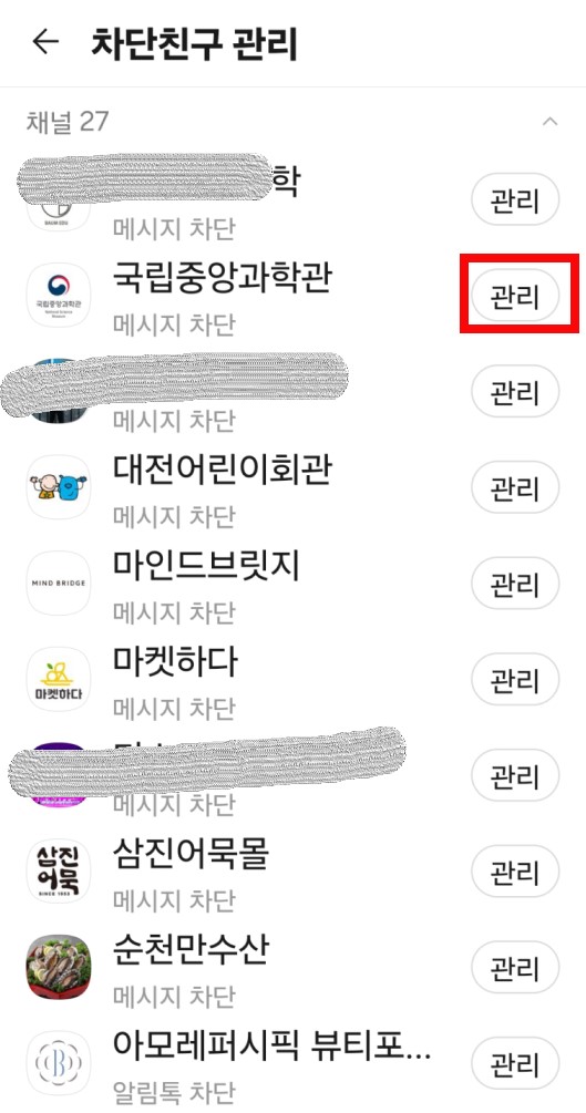 - 삭제하고 싶은 채널 옆에 있는 '관리'를 터치하면 메시지 차단, 메시지 차단 해제가 나옵니다.