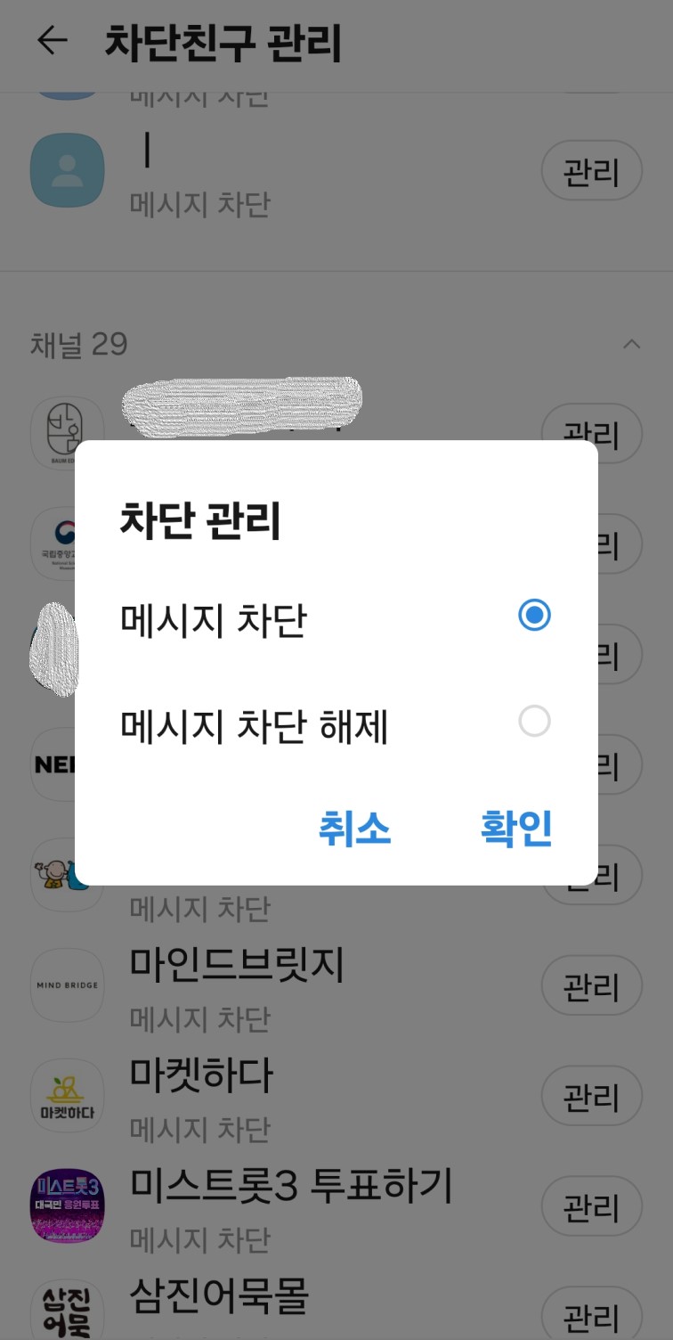 - 차단친구 관리 하단에 차단한 채널이 있습니다.