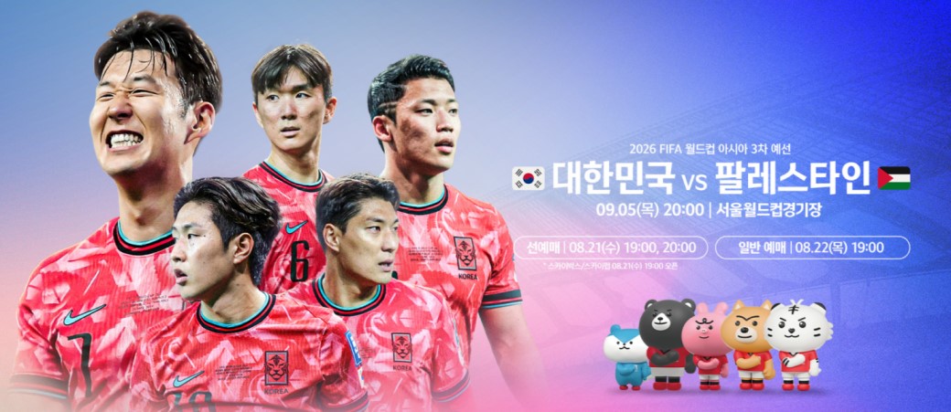 2026 FIFA 월드컵 아시아 3차전 예선인 한국 vs 팔레스타인 경기는 9월 5일(목) 20시에 서울 월드컵 경기장에서 진행됩니다. 서울에서 경기가 치러지는 만큼 예매도 가능합니다. 직관을 원하시는 분은 아직 잔여석이 남아있을 때 예매하시는 것을 추천합니다. 예매는 대한축구협회(KFA) 홈페이지에서 로그인 후에 가능합니다.