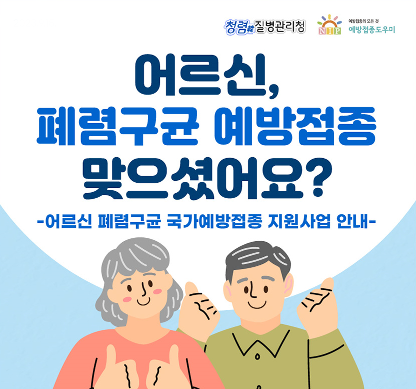 질병관리청에서는 어르신들을 위해 폐렴구균 예방접종을 시행합니다. 폐렴은 폐에 염증이 생기는 질환으로 가장 흔한 원인균은 폐렴구균입니다. 감염자의 침방울이 호흡기로 들어가면 발병하게 되며 노수막염 등 다른 질환으로 진행되면 치명률이 60~80%까지 올라가게 됩니다. 대사 연령과 접종 방법을 잘 확인하시고 예방 접종 받으시기 바랍니다.