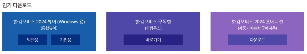 인기 다운로드 세 개가 보이실 겁니다. 이 세 개중 한컴오피스 2024 뷰어(Windows용)의 일반용을 클릭하시면 됩니다.