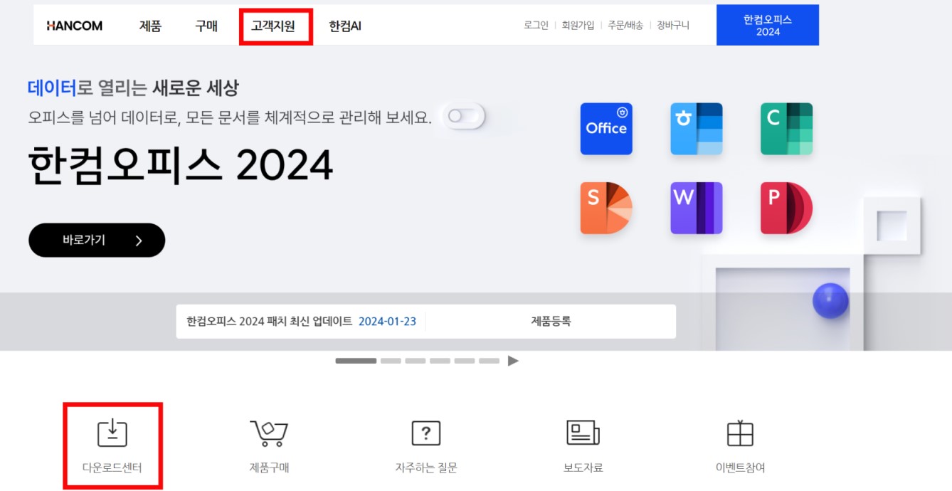 한글과 컴퓨터 홈페이지에서 한글 뷰어 프로그램을 무료로 다운로드할 수 있습니다. 홈페이지 상단의 고객지원에서 다운로드를 클릭하세요. 혹은 홈페이지 중간 왼쪽의 다운로드 센터를 클릭하세요.