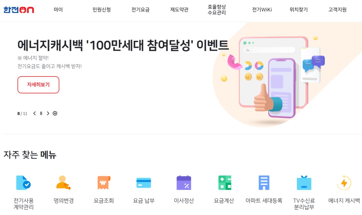 한전 고객센터의 대표전화 외에도 한전의 사이버지점인 한전ON에서도 ARS 상담과 같은 서비스를 제공하고 있습니다. 전기요금 조회와 납부, 전기 사용량 조회와 예측, 전기요금 할인신청, 계량기 설치, 안전점검 신청, 사고신고 등을 하실 수 있습니다.