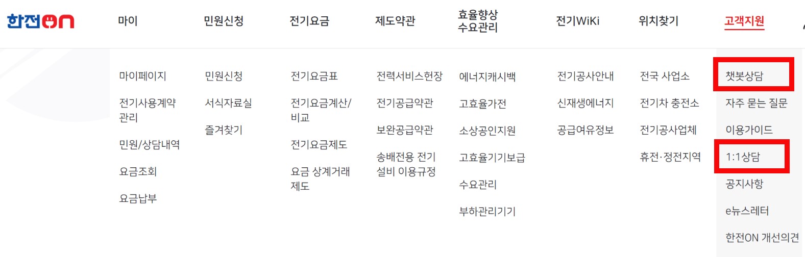 한전 고객센터의 통화대기 시간이 길 때는 한전 사이버지점 한전온의 챗봇 상담, 1:1 상담을 이용해 보세요. 고객지원 페이지에서 로그인 후에 이용하실 수 있습니다.