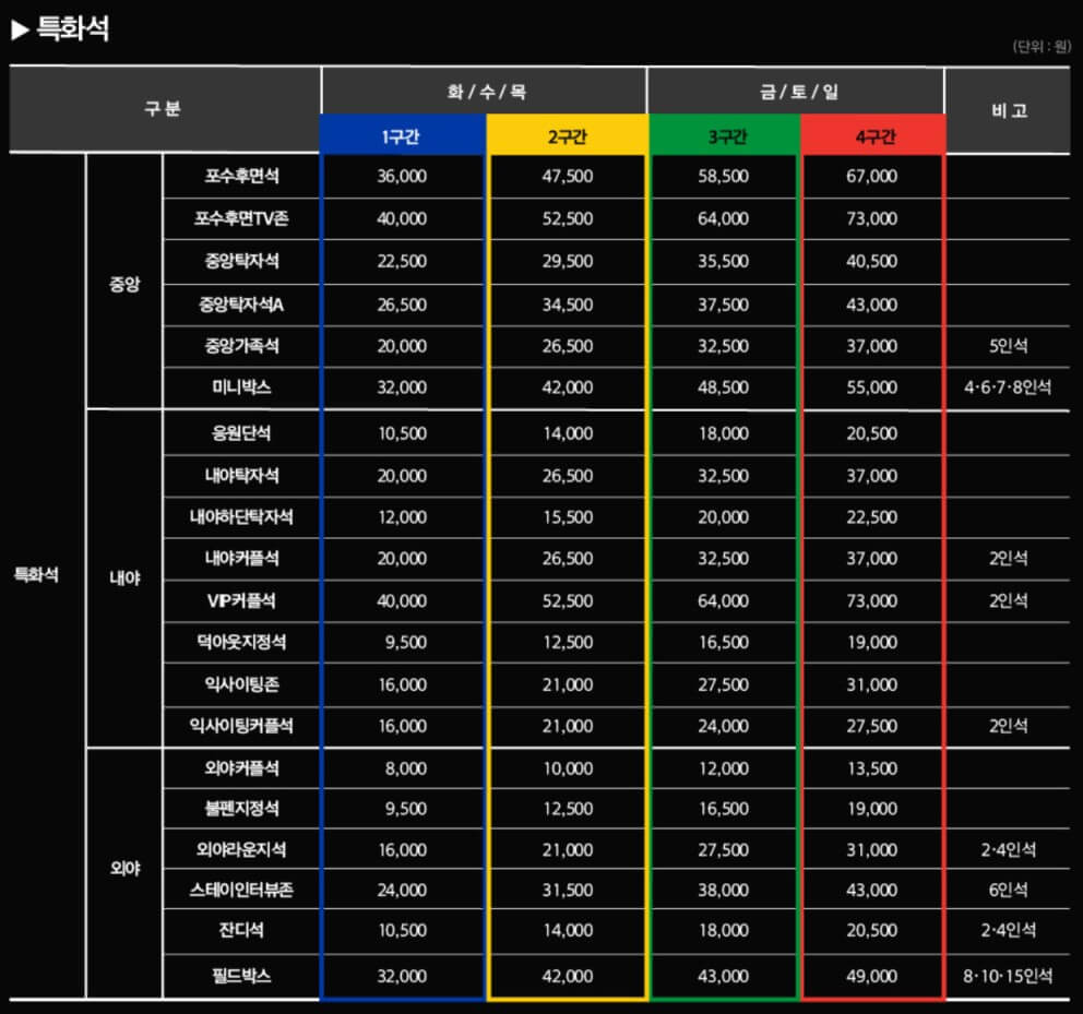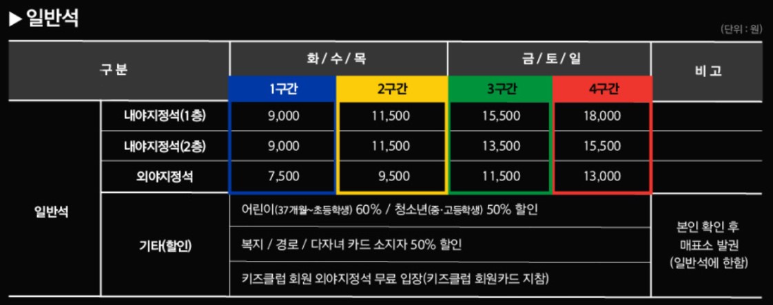 티켓은 경기 시작 일주일 전부터 오픈됩니다. 티켓 가격은 경기 일정이나 관람석의 위치와 종류에 따라서 가격이 다르니 잘 확인하시고 예매하시기 바랍니다. 9월 이후 가격은 재공지됩니다.