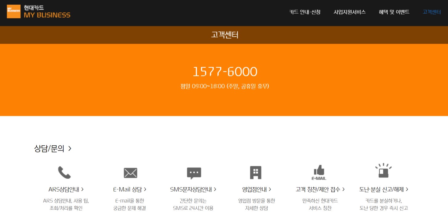 - 현대카드 콜센터 : 1577-6000(상담원 연결 1→ 1 → 0 혹은 1 → 0 → 2)