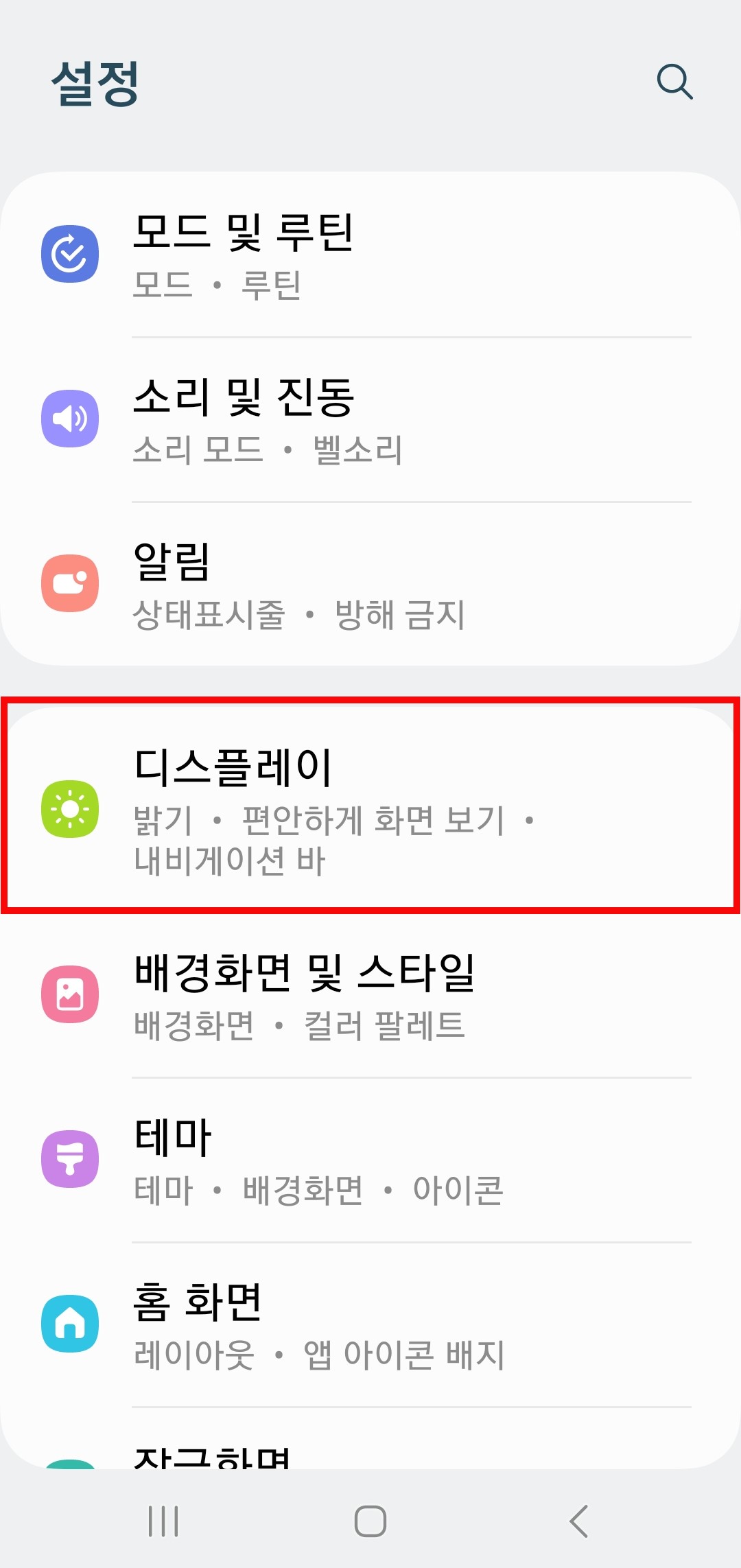 설정에 들어가면 여러 메뉴 중 아래로 내려가다 보면 디스플레이가 있습니다.