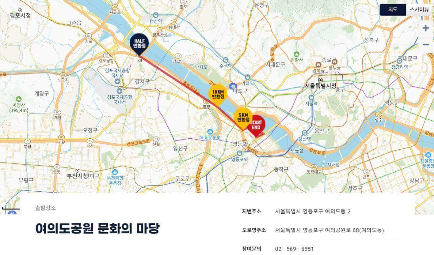 2024 불패마라톤은 여의도공원 문화의 마당에서 출발합니다. 코스별로 시간차를 두고 출발해 5km, 10km, 하프 코스의 반환점을 돌아 다시 여의도공원 문화의 마당으로 돌아오는 코스입니다.