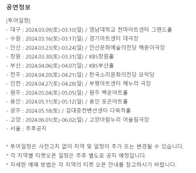 투어 일정과 장소는 확정되었지만 상황에 따라서 일정이 변경될 수도 있습니다. 티켓 예매는 대구와 수원, 안산까지 열려있고요 이후 차차 일정대로 오픈될 것입니다.
