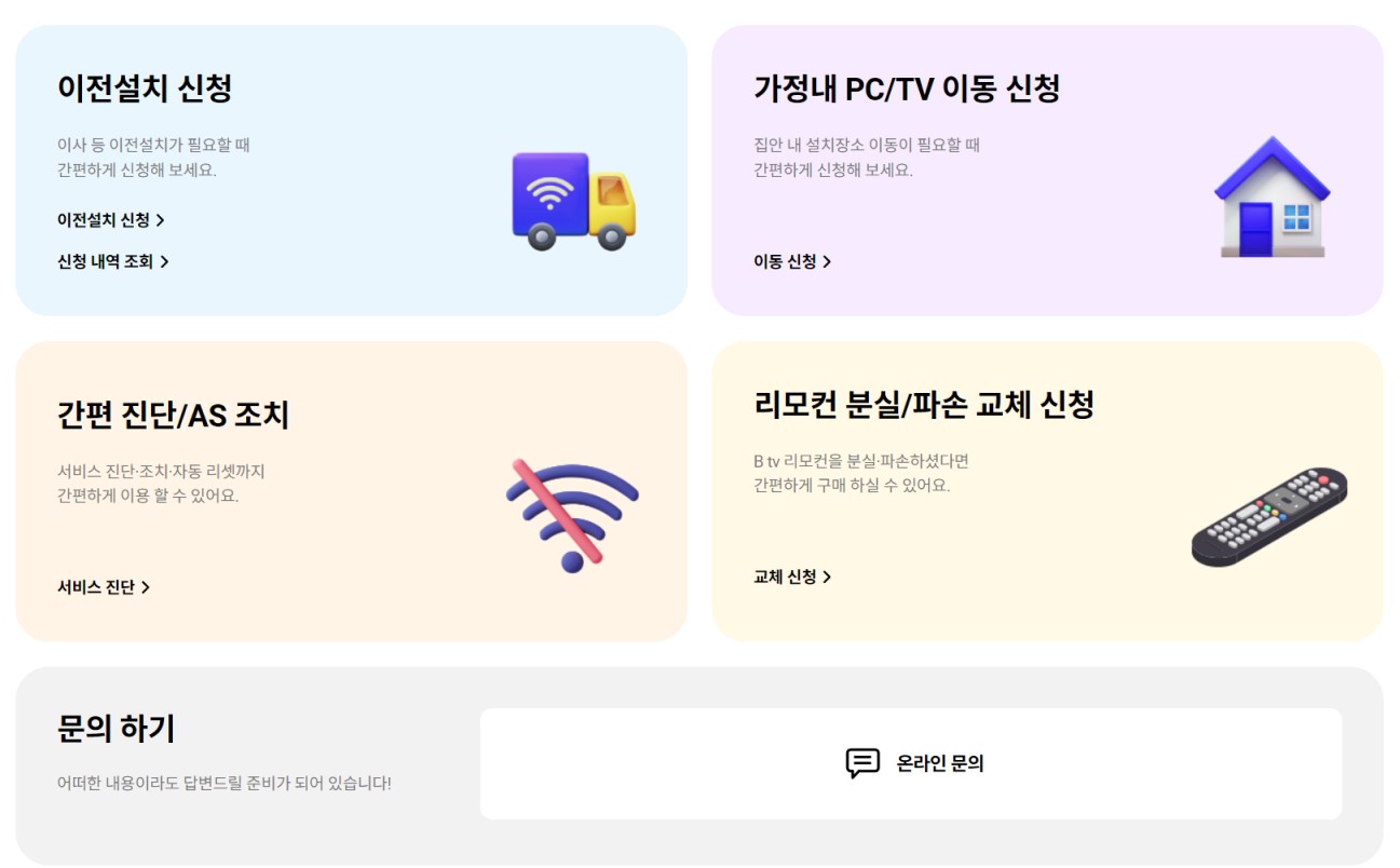 홈페이지를 통해서도 인증절차를 거친 후 이전설치, 가정 내 PC/TV 이동신청, 간편 진단 / AS 조치, 리모컨 분실/파손 교체 신청 등도 하실 수 있습니다.